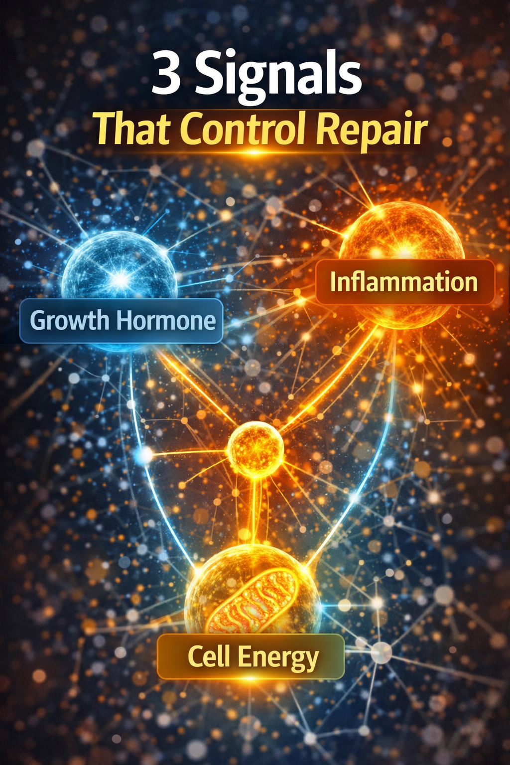 Tissue repair is controlled by coordinated signaling between hormones, peptides, immune factors, and cellular energy systems. Growth hormone plays a role, but effective repair requires proper communication across multiple systems, including inflammation control, nutrient delivery, and cellular regeneration pathways.