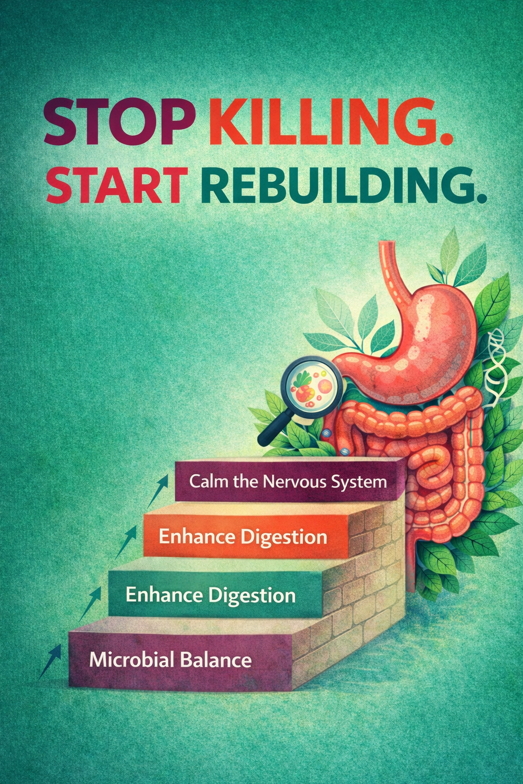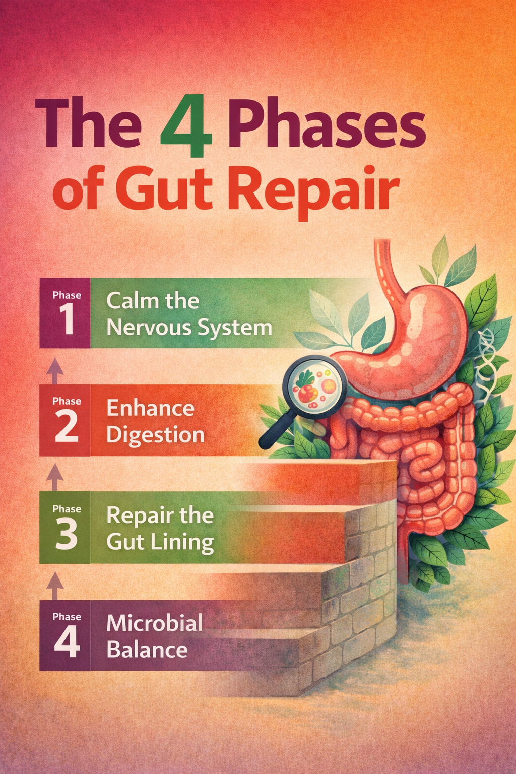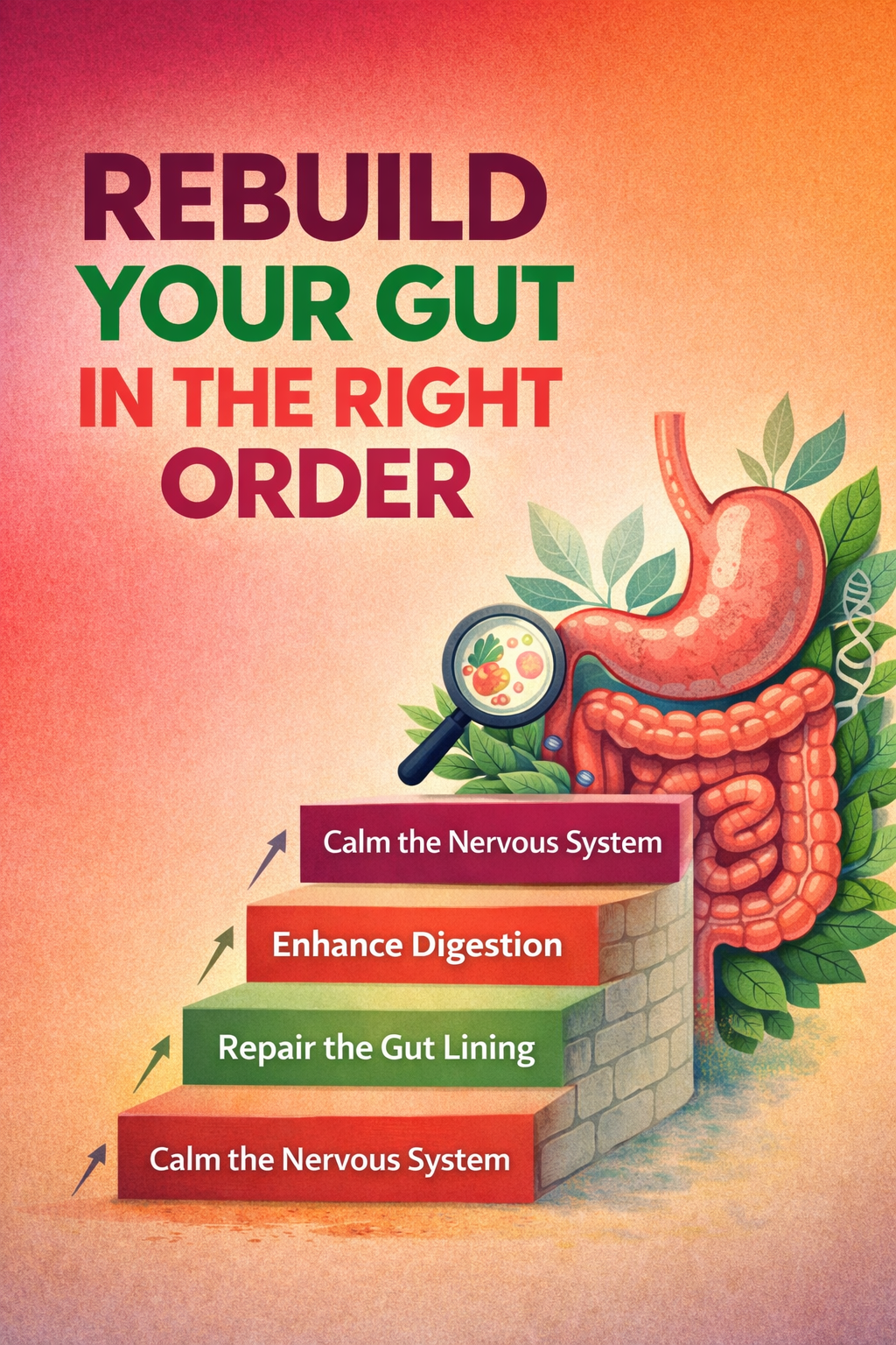 True gut repair requires restoring nervous system regulation, improving digestion, strengthening the gut lining, and stabilizing microbial balance in sequence.