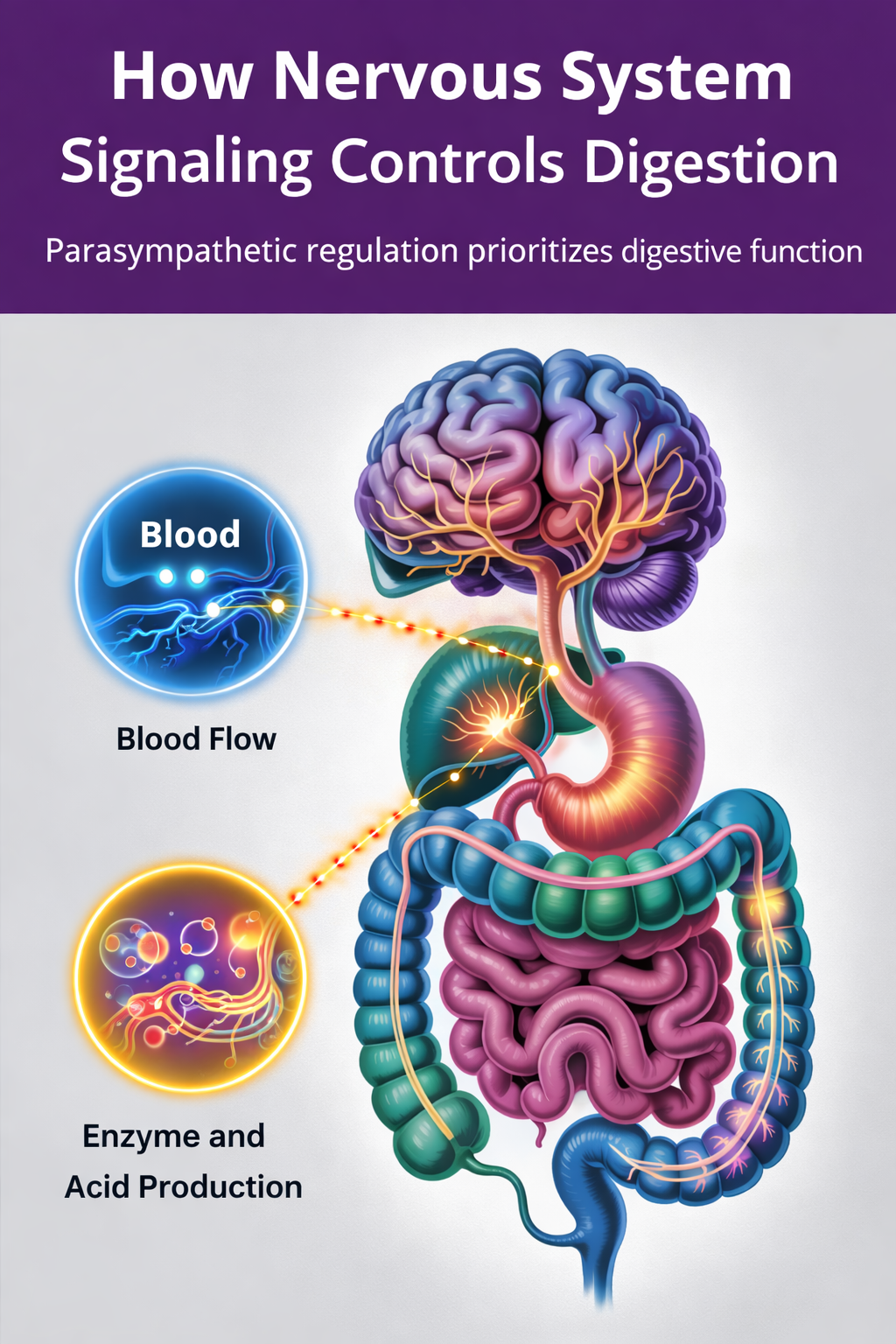 Digestion is directed by the autonomic nervous system. The brain communicates constantly with the gut through the vagus nerve. This signaling determines when acid is released, when enzymes activate, when the gut contracts, and when inflammation resolves.