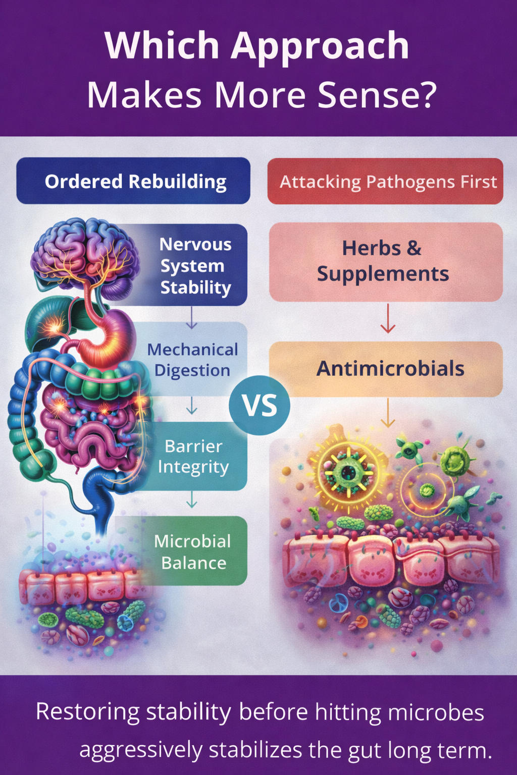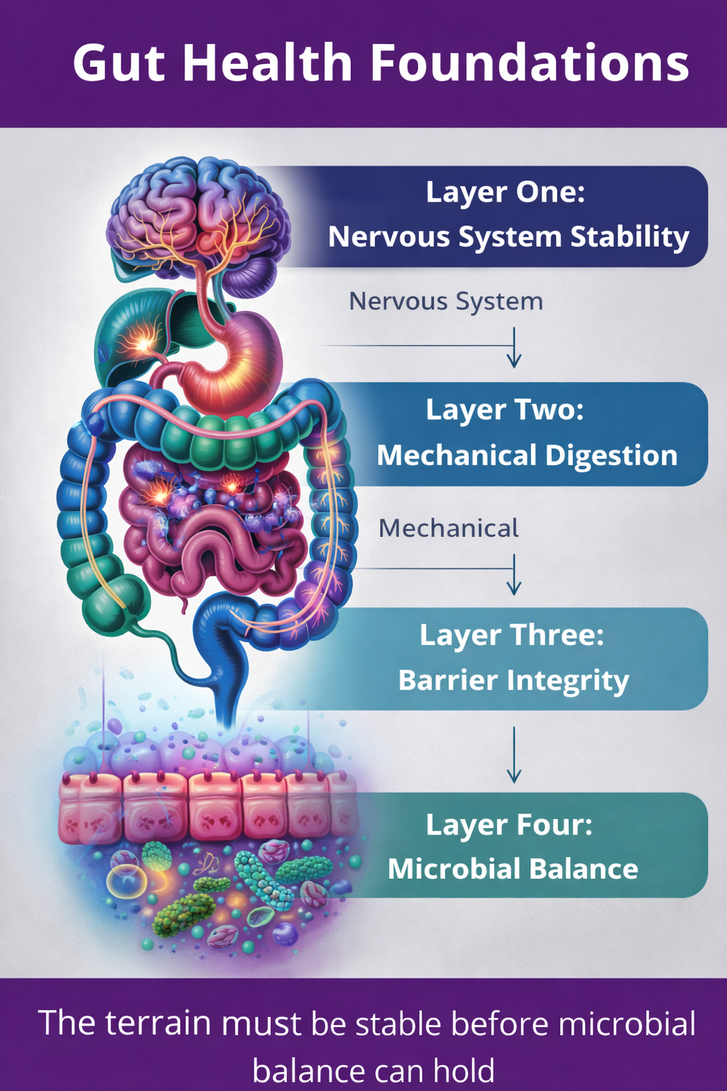 These layers matter because each one supports the next. If nervous system regulation remains unstable, digestion becomes inconsistent. If mechanical digestion is weak, food stagnates and imbalance follows. If the gut barrier is compromised, inflammation persists regardless of diet. And if microbial interventions are introduced before these layers are addressed, improvements often fade.