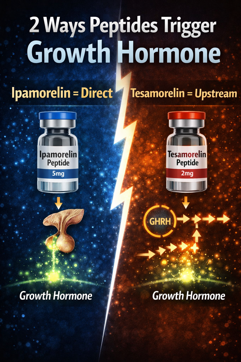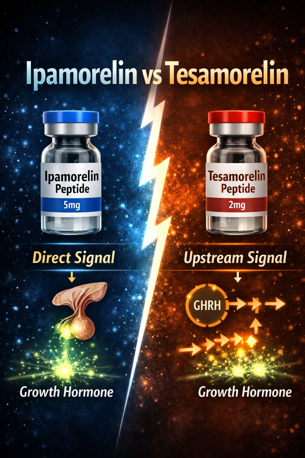 Ipamorelin and Tesamorelin differ in how they signal the release of growth hormone. Ipamorelin acts through ghrelin receptors to promote pulsatile release, while Tesamorelin mimics GHRH to influence upstream signaling and IGF-1 production. These differences can affect outcomes like metabolism, fat distribution, and tissue repair.