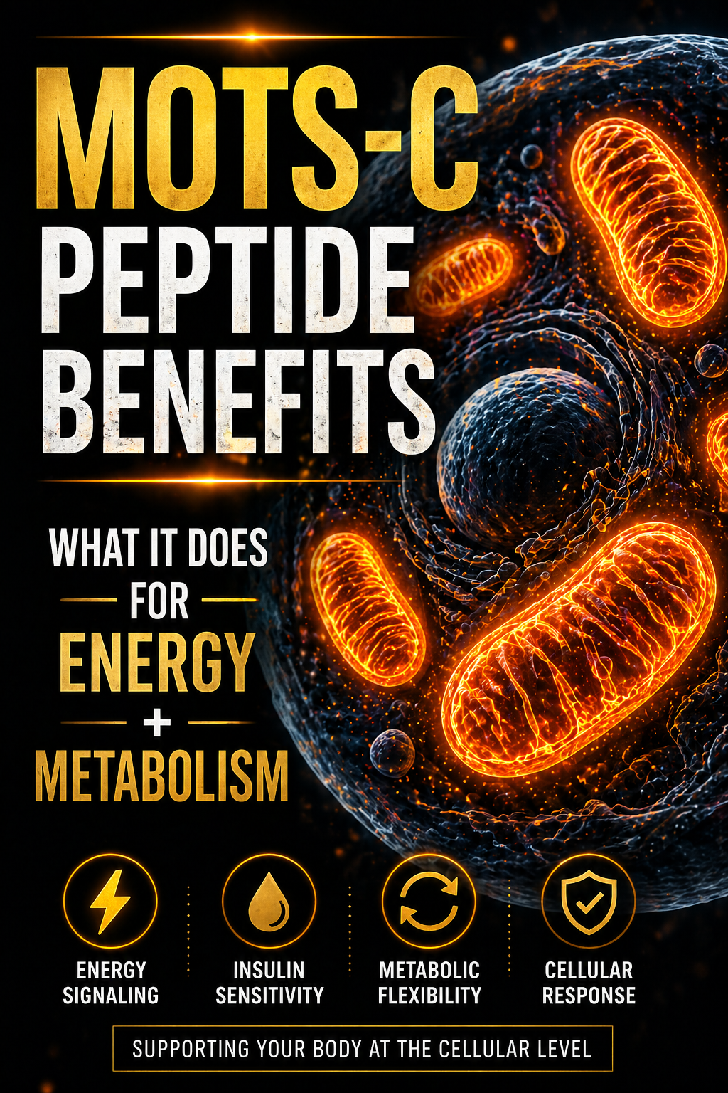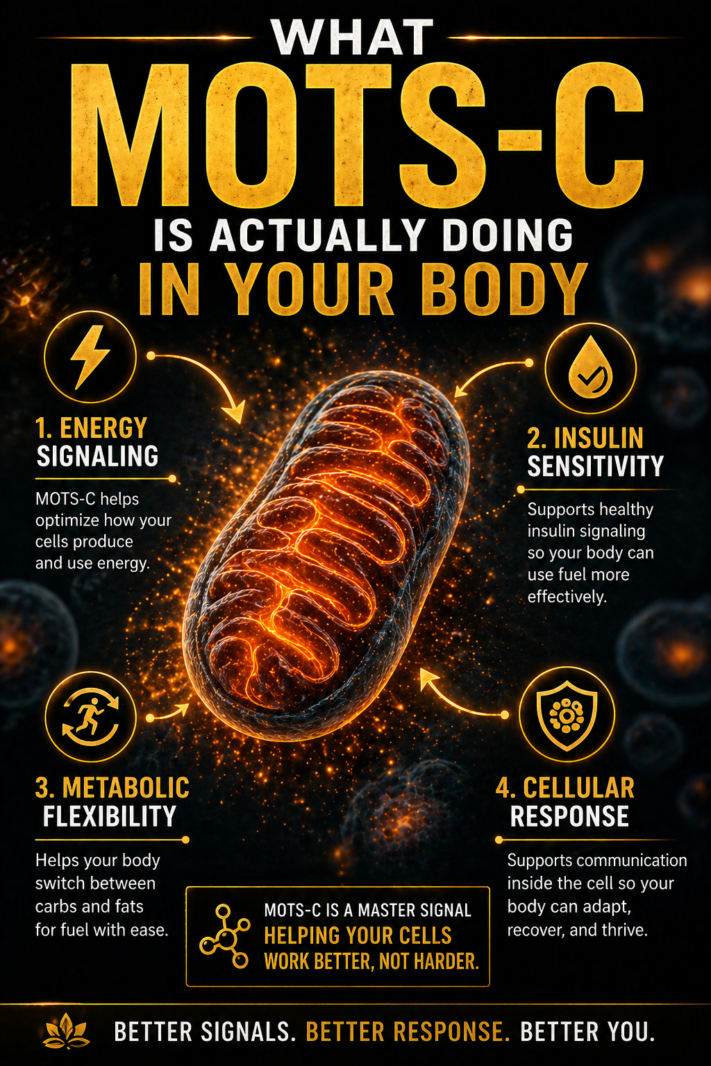 MOTS-C is a mitochondrial-derived peptide your body naturally makes to help regulate energy use, metabolic stress, and cellular adaptation. It is important because it acts like a communication signal between the mitochondria and the rest of the cell, helping influence glucose use, AMPK activation, and metabolic flexibility.